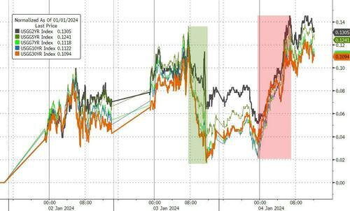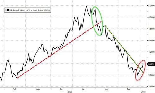 在周四,各期限美债收益率依然延续了开年以来的涨势,10年期美债收益率更是彻底站上了4%关口,债券收益率与价格反向。可以说,美债市场在新年突然掀起的抛售行情再度令许多投资者措手不及,指标10年期美债收益率在新年前三个交易日已累计上涨了约15个基点。