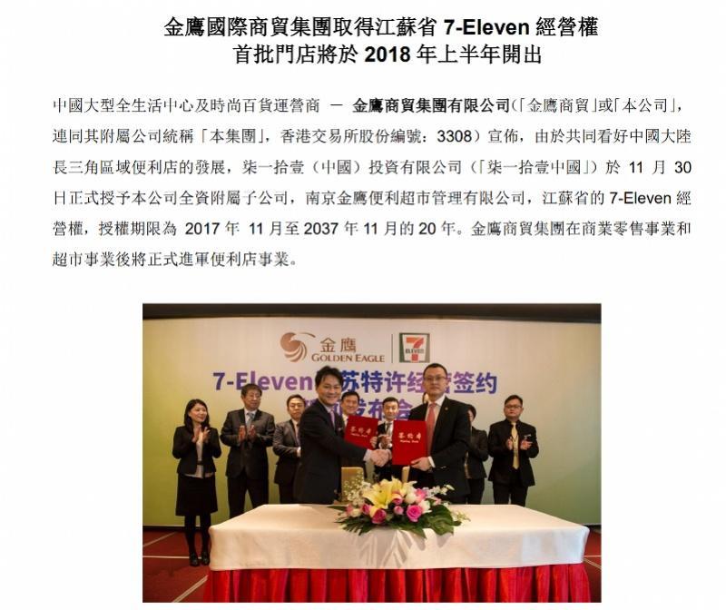 公开资料显示,江苏省7-11的经营权主要由南京金鹰便利超市有限公司负责,后者是金鹰商贸集团有限公司(下称金鹰商贸)旗下企业,2017年11月,金鹰商贸与柒-拾壹(成都)有限公司签订20年合约,拿下江苏省7-11门店的特许经营权,负责运作加盟等业务。