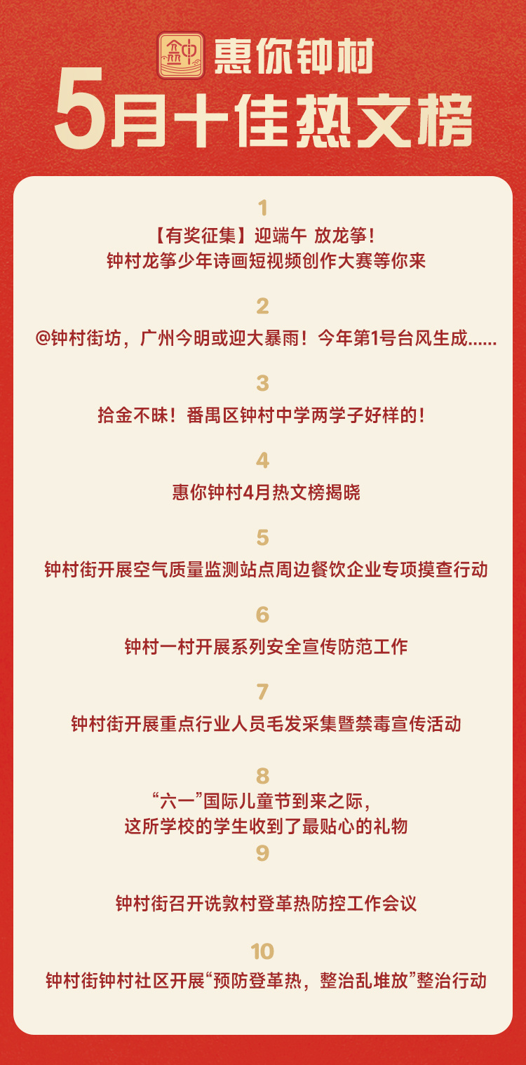 惠你钟村每月热文盘点时刻又来到!上个月,平台累计发布60篇原创稿件,“登革热防控”“禁毒宣传 ”“ 公益讲座”等成为通讯员笔下的关键词,描绘出街坊丰富、有趣的生活常态。